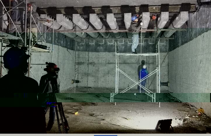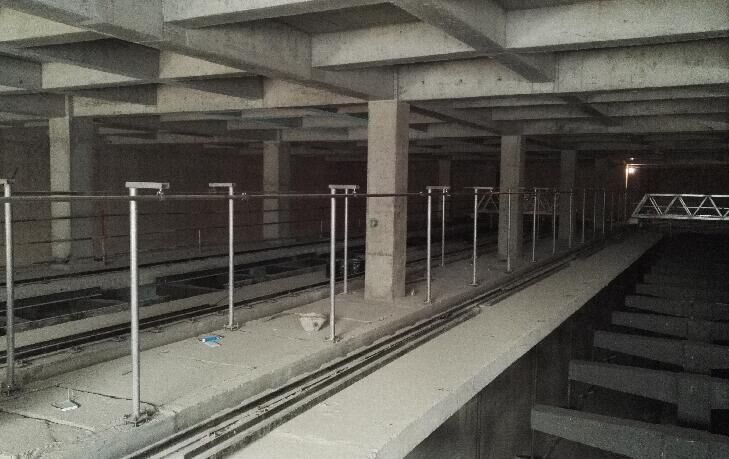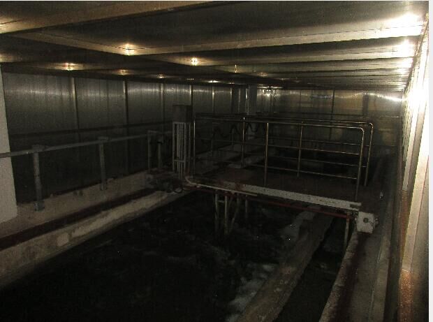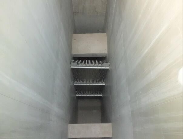 2.粗格柵安裝完畢。粗格柵安裝于粗格柵設(shè)備間的池底,粗格柵池深12.8米,寬2米。粗格柵為不銹鋼材質(zhì),高6米,寬1.96米,厚0.5米.粗格柵共6臺。