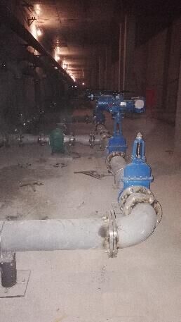 7 .初沉池設(shè)備間安裝。設(shè)備間長度為288米,共17臺排泥泵,泵體及管道排布均在一條直線。
